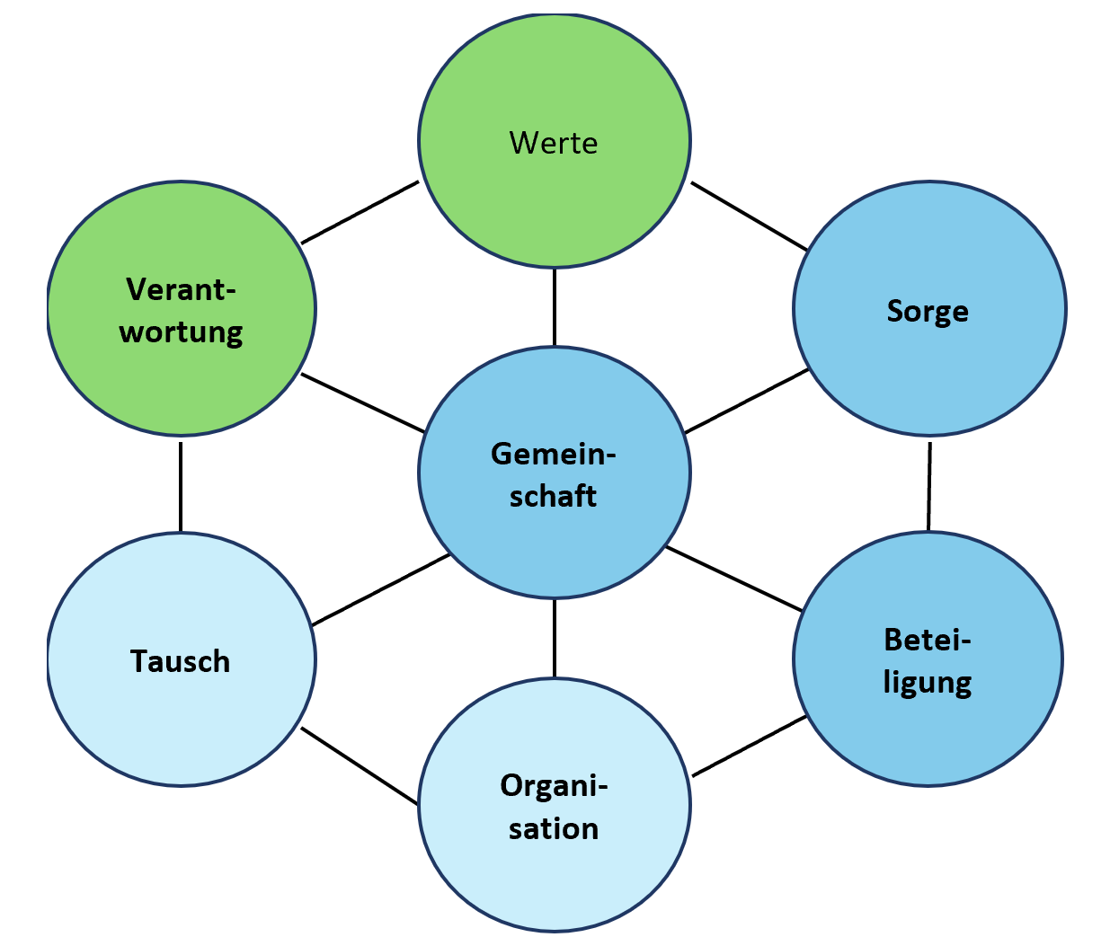 Der Aufbau eines solidarischen Netzwerks mit agilen Strukturen ist die eine Seite, die andere Seite ist eine nicht abgeschlossene inhaltliche Diskussion, was genau unter Caring Communities verstanden wird. Peter Zängl hat mit dem 7E Model2 die Begriffsklärung wesentlich vorangebracht, doch Caring Communities sind weiterhin sehr heterogen konnotiert und es besteht eine definitorische Unschärfe.