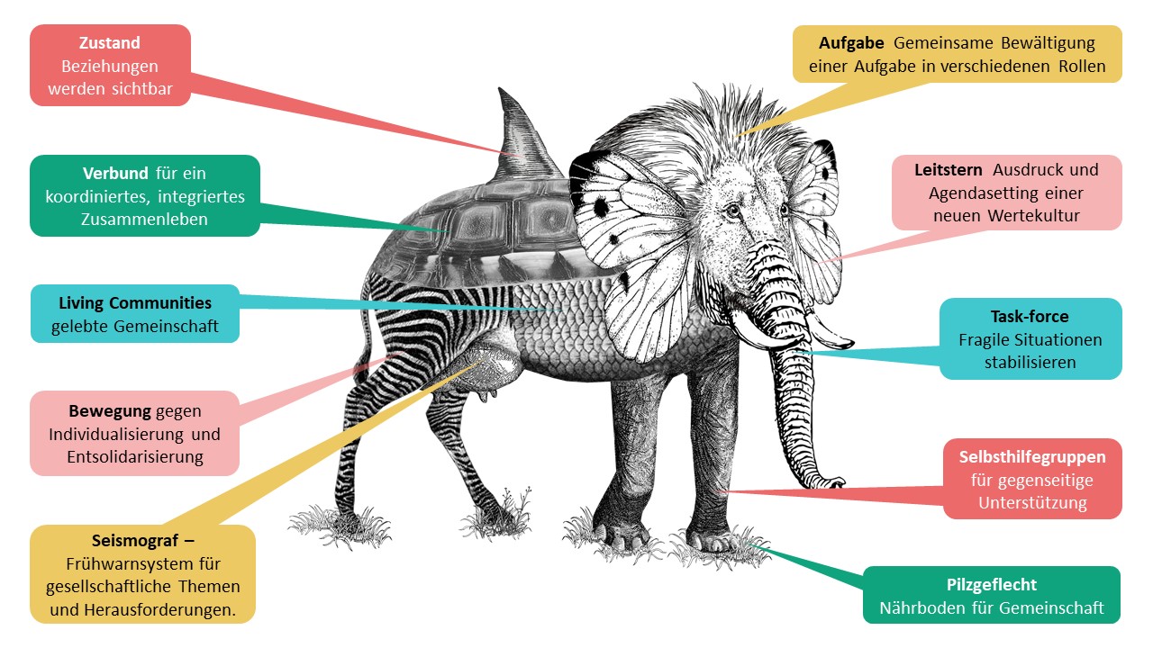 Dieser unbefriedigende Zustand hat Cornelia Hürzeler inspiriert, den Carefant3 zu kreieren. Das kraftvolle Fabelwesen bringt die unterschiedlichen Vorstellungen und Ansprüche, die mit Caring Communities assoziiert werden, anschaulich auf den Punkt. Das Ringen um Klarheit ist damit jedoch nicht abgeschlossen, vielmehr zeigt der Carfant, die Notwendigkeit einer permanenten kritischen Reflexion auf.
